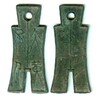 殊布。形制和小方足布相似,體形較小,首上有小圓孔。這種布也分大、小二品。大者通高約10厘米,面文較難認(rèn),一般釋為“殊布當(dāng)釿”,背文為“十貨”。小者通高約4厘米,面文為“四布”,背文為“當(dāng)釿”。大布多出于今豫東、安徽、江蘇、浙江和魯南等地,小布極。以上地區(qū)戰(zhàn)國時屬楚,故此布似為楚幣。