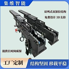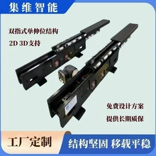 伸縮貨叉一般采用三節(jié)伸縮設(shè)計(也就是所謂的單伸位或單深位結(jié)構(gòu)),即一節(jié)固定叉體、兩節(jié)可伸縮叉體,再輔以導(dǎo)向滾輪(凸輪、軸承)、導(dǎo)向滑塊、齒輪齒條(或鏈輪鏈條、或同步帶)、限位開關(guān)(行程開關(guān))、中位開關(guān)(接近開關(guān))、扭力限制器、電機、減速機、編碼器、驅(qū)動器、聯(lián)軸器等部件構(gòu)成的一個完整的伸縮或移載機構(gòu)!