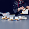 內蒙古特色工藝品瓷器草原長河(茶具)套裝在原有傳統(tǒng)蒙古茶壺基礎上,經過反復雕琢,孕育出了富有當代魅力的藝術品。壺蓋上端的蒙古大營駐扎在古老的犄角紋上面,古樸的氣息撲面而來,但是在舒展大方的線條搭配下,又不失現(xiàn)代史上時尚的味道;壺頸處上下對稱的回形紋劃過倆條沉穩(wěn)的金線,底座的水浪托舉著整個壺身。下方S形底座像草原過的蜿蜒長河,使得作品增添了遼闊的意境和豪邁的氣勢。