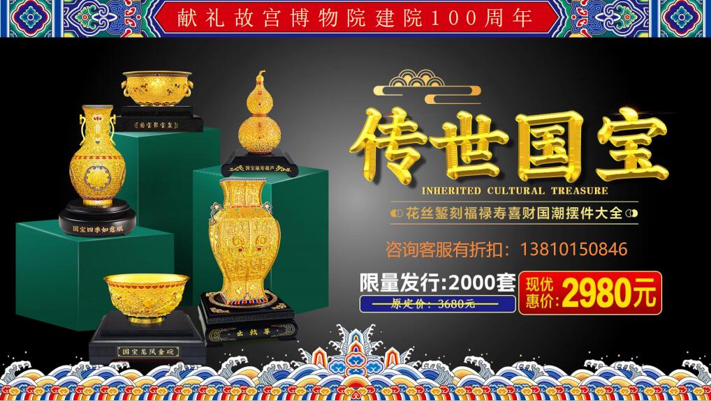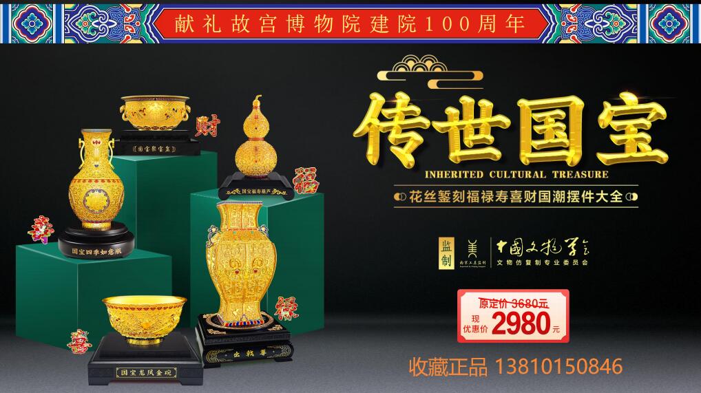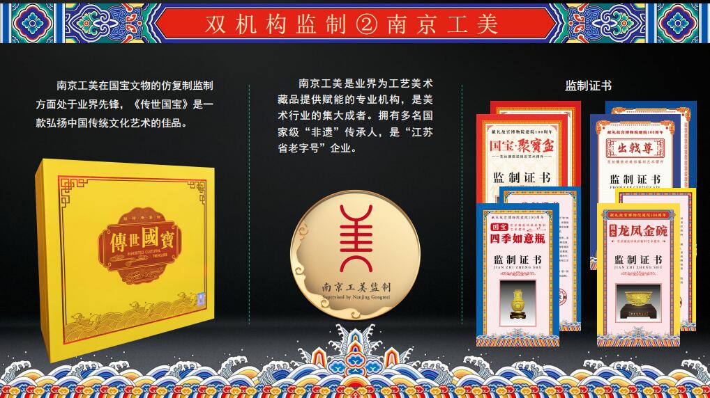 《國(guó)寶福壽葫蘆》花絲鑲嵌琺瑯彩藝術(shù)擺件,傳承中國(guó)古代花絲鑲嵌、琺瑯彩、金屬整刻工藝,與當(dāng)代國(guó)際工藝進(jìn)行融合,外觀精美、色彩精妙、設(shè)計(jì)精細(xì)、工藝,無(wú)論遠(yuǎn)觀還是近看,都美輪美奐、惟妙惟肖,堪稱花絲鑲嵌琺瑯彩內(nèi)刻精工藝術(shù)擺件實(shí)至名歸。南京工美在國(guó)寶文物的仿復(fù)制監(jiān)制方面處于業(yè)界先鋒,《傳世國(guó)寶》是一款弘揚(yáng)中國(guó)傳統(tǒng)文化藝術(shù)的佳品。