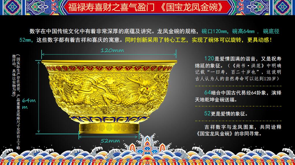 數(shù)字在中國(guó)傳統(tǒng)文化中有著非常深厚的底蘊(yùn)及講究。龍鳳金碗的規(guī)格,碗口120mm,碗高64mm ,碗底徑52mm,這些數(shù)字都有著吉祥和喜慶的寓意。同時(shí)創(chuàng)新采用了轉(zhuǎn)心工藝,實(shí)現(xiàn)了碗體可以旋轉(zhuǎn),更具動(dòng)感!