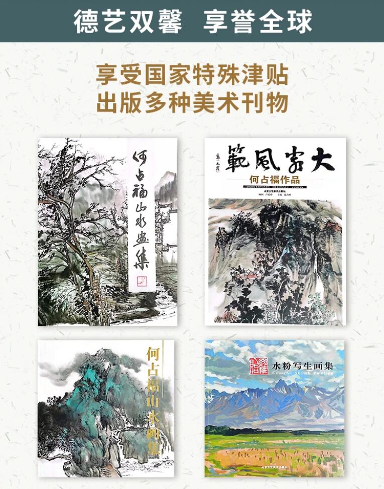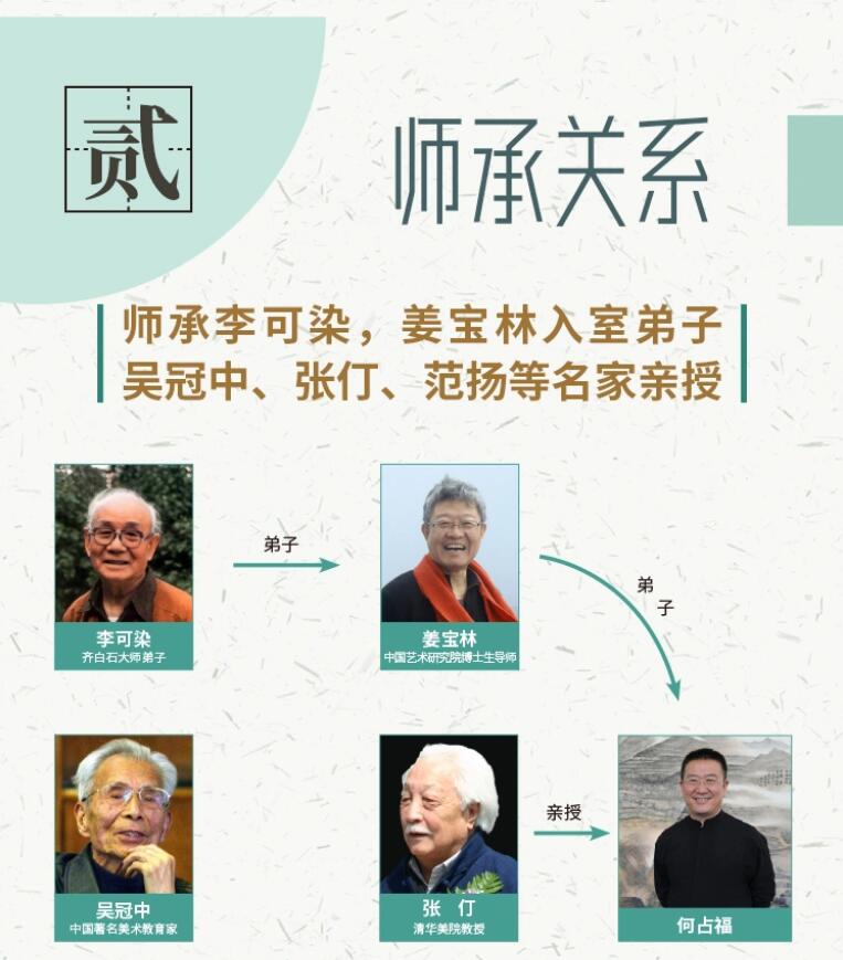 何占福,自幼喜好繪畫臨摹《芥子園畫譜》,為姜寶林大師入室弟子,得到過吳冠中、張仃等巨匠親授,受教于清華美院院長魯曉波、中國國家畫院山水畫研究室主任范揚、中央美術學院客座教授史國良等當代名家。
