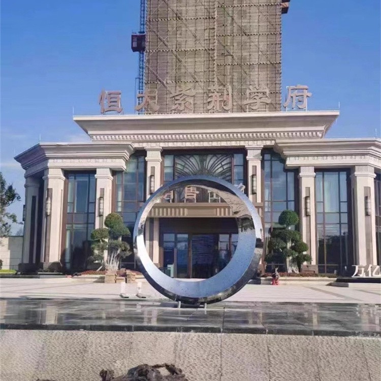 圓環(huán)雕塑是以用簡約的抽象形態(tài)來表達出具象雕塑所不具有的視覺感受,在特定的環(huán)境當中,通過雕塑的體積大小、形態(tài)特征等來襯托出人們的心理反應。這樣的雕塑多以不銹鋼為主,尤其是鏡面效果因為其反光性,在特定的光源環(huán)境中會更容易給人帶來質(zhì)感。一般來說,圓環(huán)雕塑象征圓滿、團圓,跟月亮這個大元素相切合,所以人們也把它們看做是抽象月亮雕塑。