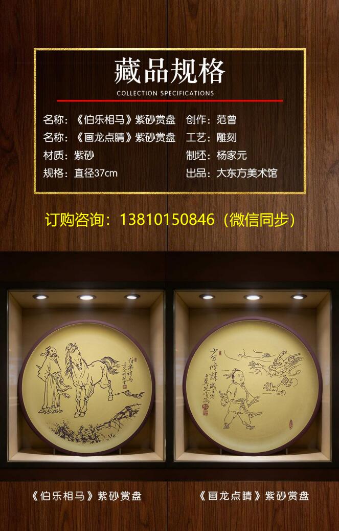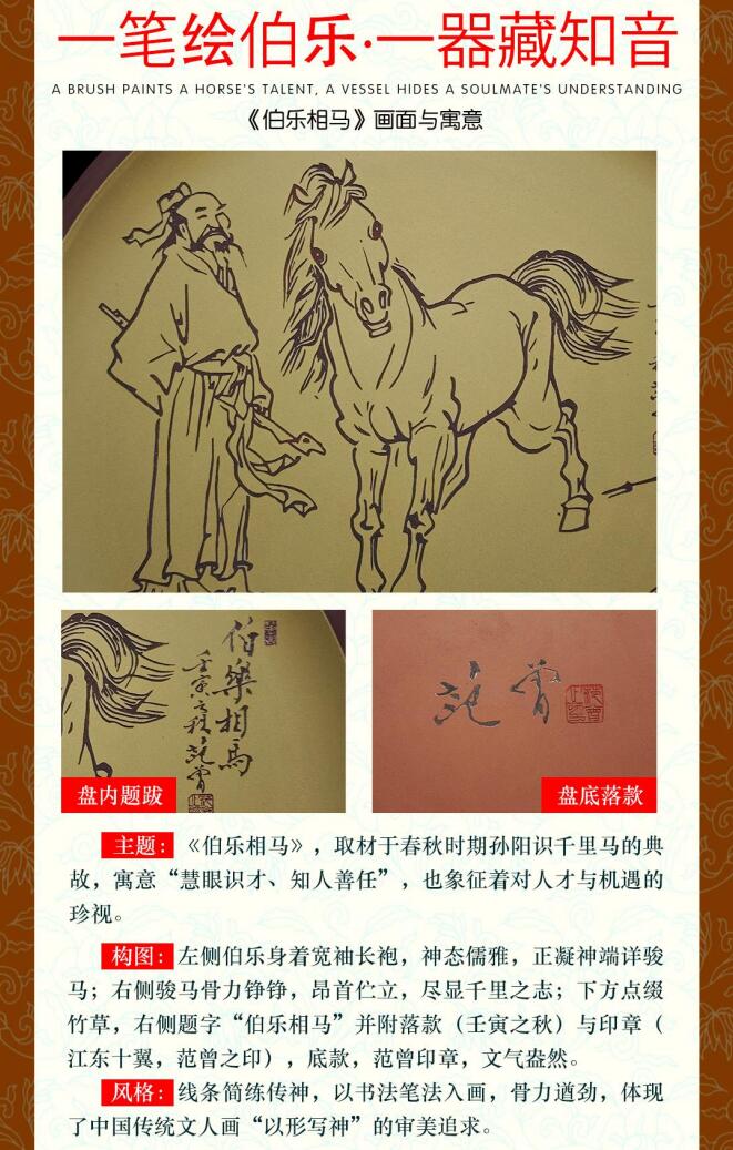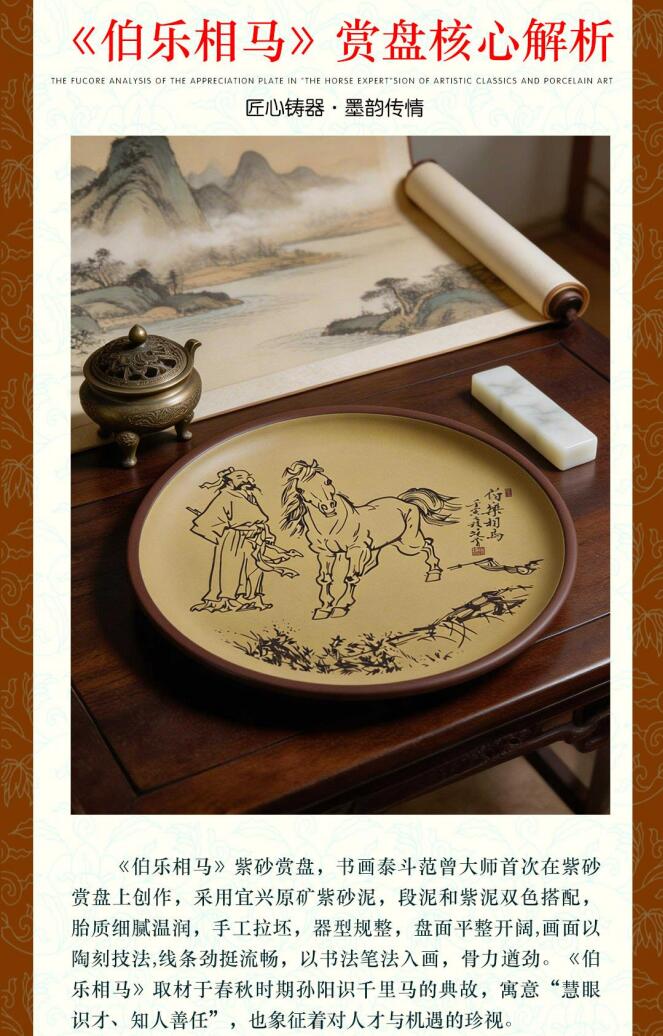 《伯樂(lè)相馬》紫砂賞盤,書畫范曾大師在紫砂賞盤上創(chuàng)作,采用宜興原礦紫砂泥,段泥和紫泥雙色搭配,胎質(zhì)細(xì)膩溫潤(rùn),手工拉坯,器型規(guī)整,盤面平整開闊,畫面以陶刻技法,線條勁挺流暢,以書法筆法入畫,骨力遒勁?!恫畼?lè)相馬》取材于春秋時(shí)期孫陽(yáng)識(shí)千里馬的典故,寓意“慧眼識(shí)才、知人善任”,也象征著對(duì)人才與機(jī)遇的珍視。