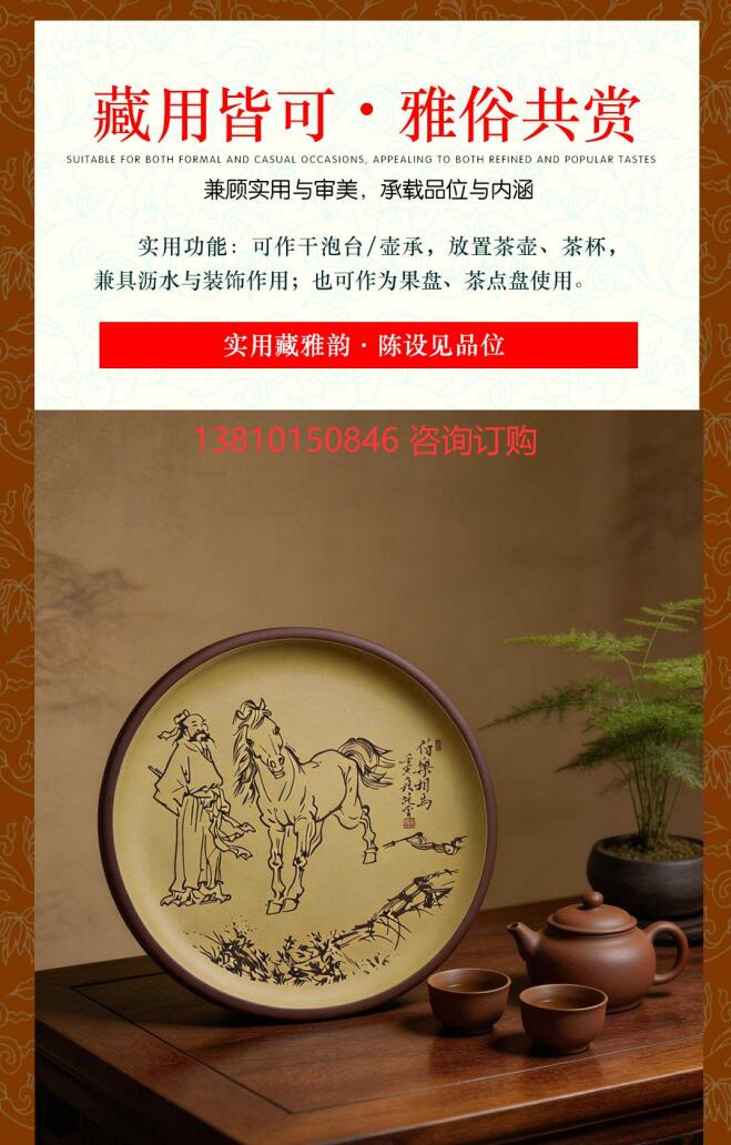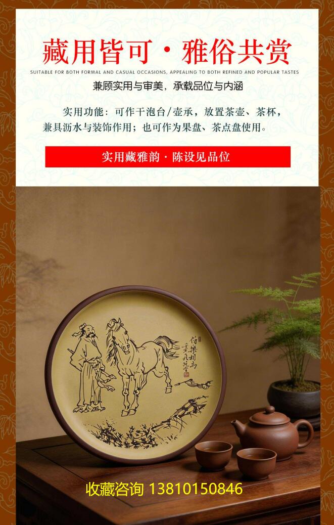 裝飾技法:以陶刻技法呈現(xiàn)畫面,線條勁挺流暢,是典型的文人畫風(fēng)格。盤心圖案源自范曾《伯樂(lè)相馬圖》,將書畫藝術(shù)與紫砂材質(zhì)結(jié)合。
