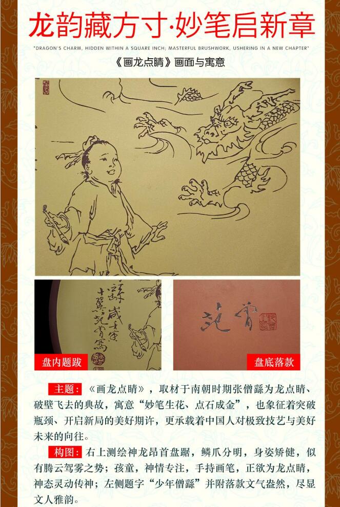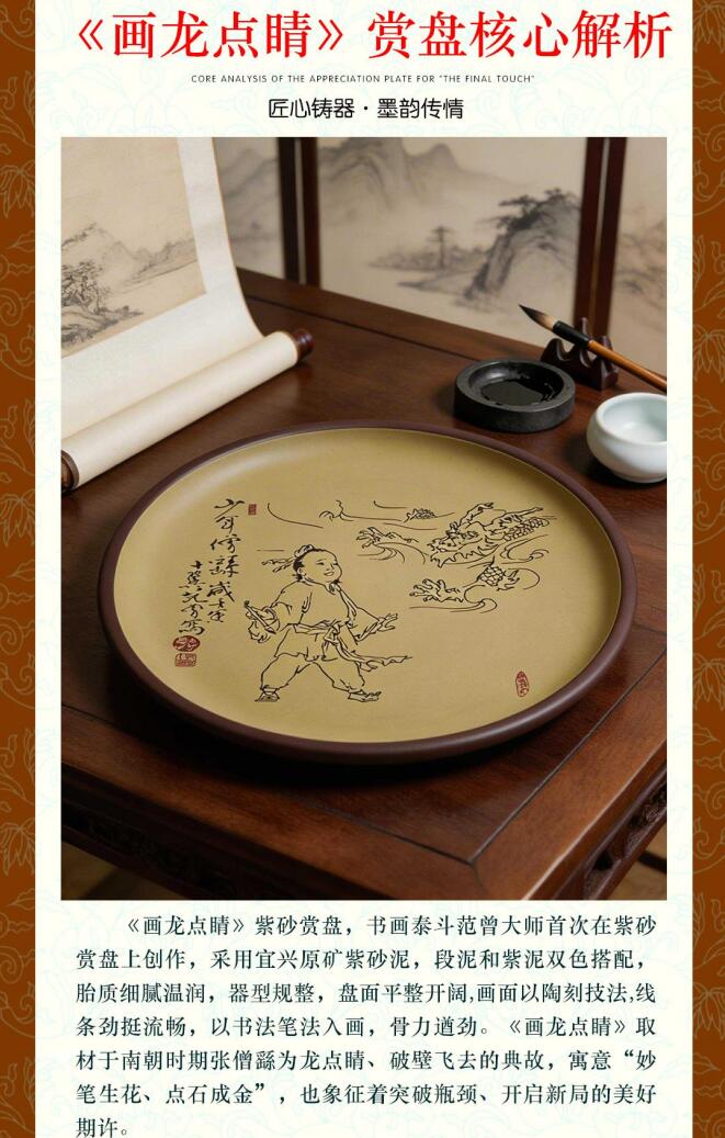 《伯樂(lè)相馬》紫砂賞盤《畫龍點(diǎn)睛》紫砂賞盤是隨著紫砂發(fā)展而衍生出來(lái)的一類藝術(shù)品種,它融書法、繪畫、金石、篆刻等藝術(shù)形式為一體,是中國(guó)文人、陶藝從業(yè)者悉心合作的結(jié)晶,目前已成為大限度體現(xiàn)紫砂文化魅力的一種產(chǎn)品形式。