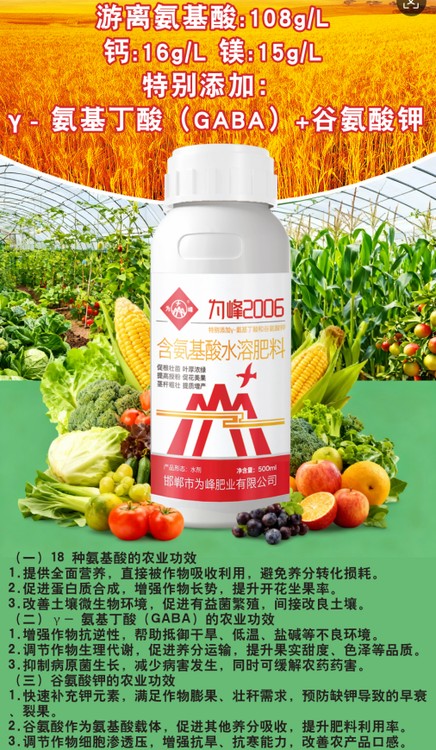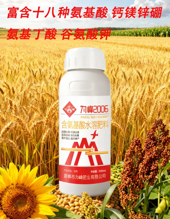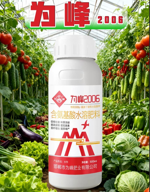 為峰 2006 葉面肥是為峰肥業(yè) 20 周年重磅推出的營養(yǎng)產品,配方科學、功效。其含有的 18 種氨基酸、鈣鎂鋅硼、γ- 氨基丁酸、谷氨酸鉀等成分,為作物生長提供全面營養(yǎng)。苗期可促進根系發(fā)達,須根增多,提高幼苗成活率與抗逆性。生長期讓植株長勢旺盛,莖稈粗壯,葉片濃綠肥厚,光合作用增強?;ü诒;ū9Ч@著,減少落花落果,提高坐果率與果實均勻度。膨果期促進果實快速膨大,增加單果重量,提升果實甜度與色澤。同時可增強果皮韌性,減少裂果、爛果,延長保鮮期??杉せ钭魑锩庖呦到y(tǒng),增強抗病能力,減少農藥使用。適配糧食、蔬菜、果樹、花卉等多種作物,全周期使用安全,實現(xiàn)增產提質雙重目標。