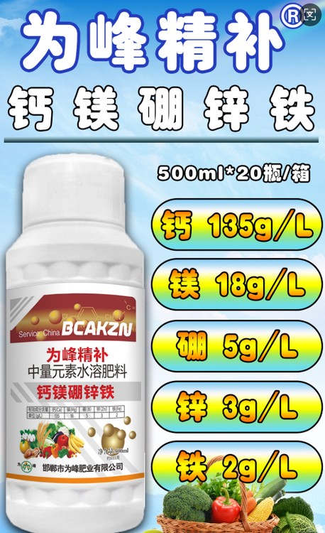 為峰精補鈣鎂硼鋅鐵,協(xié)同發(fā)力提升光合作用,促進花芽分化與花果發(fā)育,實現(xiàn)作物全程優(yōu)質(zhì)生長。鎂元素作為葉綠素關(guān)鍵成分,能快速改善葉片發(fā)黃、長勢衰弱問題,顯著提升光合利用率,促進養(yǎng)分轉(zhuǎn)化與積累,為花芽分化和作物生長提供充足能量;硼元素調(diào)控花芽分化,促進花芽飽滿、花期整齊,減少畸形花芽,提高坐果潛力;鈣元素強化植株細胞壁,增強植株韌性,鋅鐵補充微量元素,改善植株長勢,增強抗逆能力。多種元素科學(xué)配比、協(xié)同作用,既能解決作物光合不足、花芽分化差的問題,又能提升植株整體長勢,減少落花落蕾,為后續(xù)?;ū9⒐麑嵟虼蟮於ɑA(chǔ),適配各類經(jīng)濟作物與糧食作物,助力種植戶輕松實現(xiàn)苗期壯、花期齊、果期優(yōu)的種植目標。?