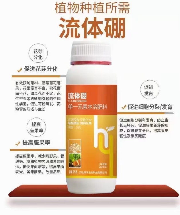流體硼對提高作物授粉受精成功率具有的作用。硼能刺激花粉管的萌發(fā)和伸長,確?;ǚ酃茼樌竭_子房完成受精。在油菜、果樹、瓜類、豆類等作物花期,噴施流體硼可顯著增加花粉活力和花粉管長度,使授粉更充分,有效減少因授粉不良引起的“花而不實”、蕾鈴脫落、幼果畸形等現象。這對于在低溫、陰雨、干旱等不良天氣下保障坐果率尤為重要。它提高了有效花、有效果的比例,直接增加了單株結果數,是?;ū9⑻岣弋a量的關鍵措施,尤其對需硼量大的作物效果極為顯著。