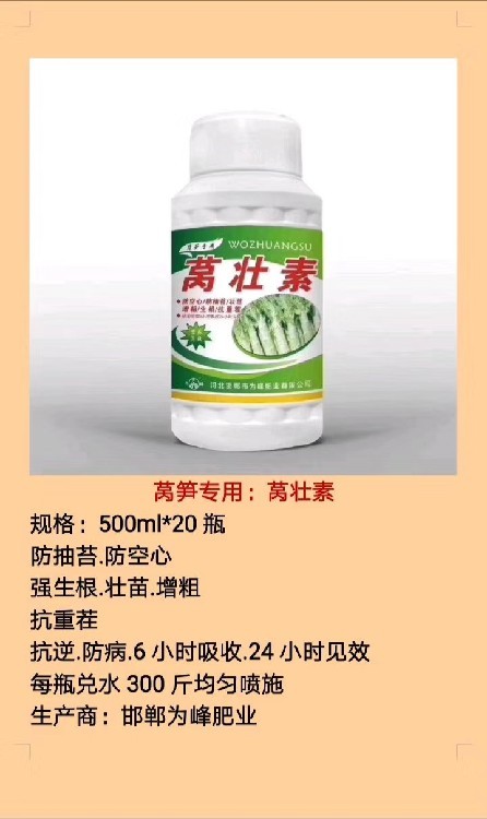萵壯素萵筍葉面肥是一款多功能葉面肥,集生根、壯苗、防病、增產(chǎn)于一體,無需搭配其他控旺、防病產(chǎn)品,簡化農(nóng)戶管理流程,降低種植成本。本品能促進萵筍根系發(fā)達,增強植株抗逆能力,有效抵御病蟲害侵襲和不良環(huán)境影響;同時調(diào)節(jié)萵筍生長節(jié)奏,避免徒長,讓營養(yǎng)集中供給莖部,實現(xiàn)莖稈膨大增粗、防空心、防裂莖。使用后,萵筍整體長勢整齊,筍體粗直、色澤鮮亮,商品率提升30%以上,產(chǎn)量顯著增加,是農(nóng)戶省心、的萵筍種植好幫手。?