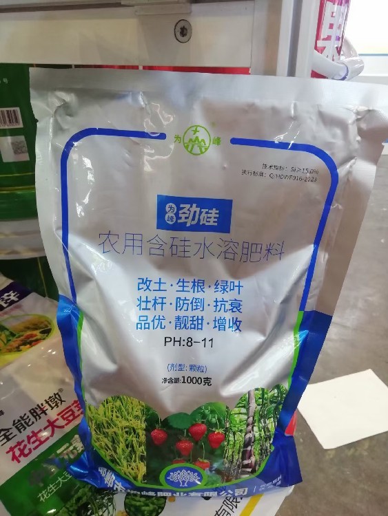 全水溶顆粒硅肥為峰勁硅,兼具養(yǎng)分供給與生長(zhǎng)調(diào)控雙重功效。它能促使作物形成致密硅化層,有效阻擋病菌蟲害侵襲,降低倒伏風(fēng)險(xiǎn),保障作物穩(wěn)健生長(zhǎng)。同時(shí)強(qiáng)化光合作用,讓葉片濃綠肥厚,促進(jìn)養(yǎng)分轉(zhuǎn)化與積累。針對(duì)土壤,可調(diào)節(jié)酸堿度、改良板結(jié)問題,活化土壤養(yǎng)分,為作物根系生長(zhǎng)創(chuàng)造良好環(huán)境。適用于水稻、果蔬等多種作物,能提升坐果率、優(yōu)化果實(shí)品質(zhì),實(shí)現(xiàn)增產(chǎn)提質(zhì),助力種植戶種植。