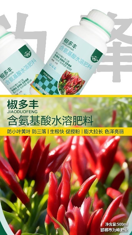 【為峰肥業(yè)】匠心推出“椒多豐”辣椒專用氨基酸葉面肥。本品專注于解決辣椒種植難題,有效保花保果,預防落花落果,助力果實膨大拉長。其特有配方能增強植株抗逆性,是椒農實現優(yōu)質高產的得力助手。誠邀各地農資伙伴加盟合作,共創(chuàng)市場。