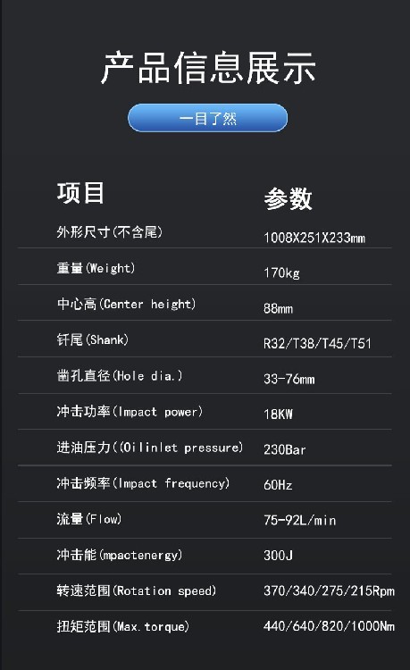 釬尾R32/T38/T45/T51/TC35(Φ52),R32/R38/T38/TC35/SR38(Φ38)沖擊功率18kw沖擊壓?230Bar沖擊頻率60Hz鑿孔直徑33-76mm外形尺?1008X292X233mm重量170KG
