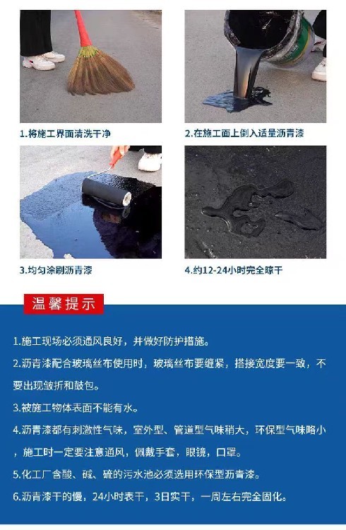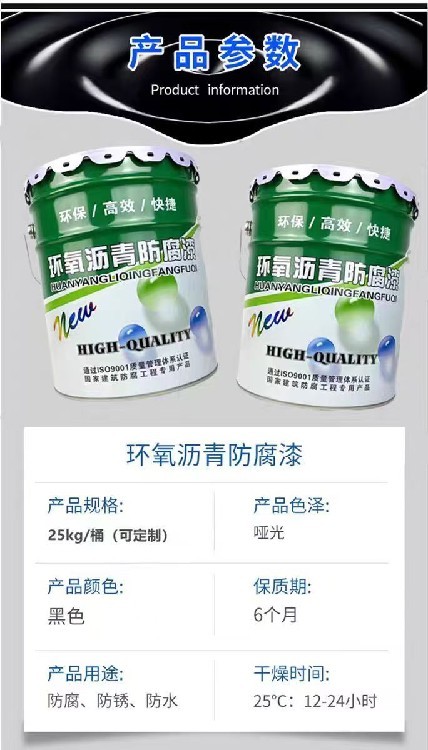 該產(chǎn)品是由環(huán)氧樹脂、煤焦油瀝青、防銹顏料、助劑、改性胺配制而成。產(chǎn)品具有干燥迅速,附著力好、柔韌性好,雙組分包裝、施工方便。具有耐酸、耐堿、耐鹽、耐水、耐油等特點(diǎn)。