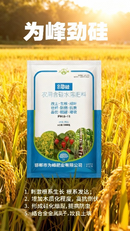 依托全水溶技術(shù),為峰勁硅硅肥能快速滲透土壤被作物吸收,肥效且持久。其可促進(jìn)作物硅化細(xì)胞生成,構(gòu)建天然防護(hù)體系,有效抵御病蟲(chóng)害與倒伏,保障作物健康生長(zhǎng)。同時(shí)提升葉綠素含量,強(qiáng)化光合作用,促進(jìn)養(yǎng)分積累,延長(zhǎng)作物生長(zhǎng)期。此外能活化土壤中固化的磷元素,改良土壤環(huán)境,增強(qiáng)作物抗旱、抗寒等抗逆能力。適用于各類農(nóng)作物,可提升果實(shí)品質(zhì)與產(chǎn)量,為種植生產(chǎn)提供有力支撐。