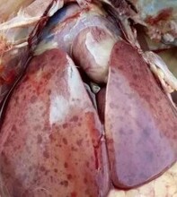 3.心包積水,心力衰竭,心包內(nèi)有大約10-30毫升液體,積水為黃色透明,為漏出液,肝臟腫大實質(zhì)樣變,發(fā)黃,有條紋狀壞死,出血,肺臟淤血,水腫,腎臟腫大出血,多混有別的疾病感染而表現(xiàn)為腺胃有出血帶,腸道出血斑。死亡后的充血淤血,肝臟質(zhì)地變脆,色澤變暗,肝臟表面可見壞死斑塊或粟粒樣壞死點。腎臟蒼白或暗黃色,腎臟輕度腫脹。