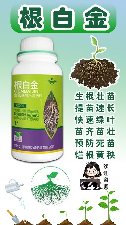 根白金生根劑以生根、養(yǎng)根、護(hù)根為核心功能,快速構(gòu)建發(fā)達(dá)根系網(wǎng)絡(luò),提升根系活力與吸收效率。有效縮短緩苗期,提高作物定植成活率,解決發(fā)根慢、長(zhǎng)勢(shì)弱難題。增強(qiáng)作物抗逆抗病能力,應(yīng)對(duì)不良環(huán)境與土傳病害,減少死苗爛根。補(bǔ)充螯合態(tài)中微量元素,平衡營(yíng)養(yǎng),促進(jìn)葉片濃綠肥厚。改善土壤結(jié)構(gòu),增加透氣性,緩解重茬障礙,助力作物根深葉茂、高產(chǎn)優(yōu)質(zhì)。