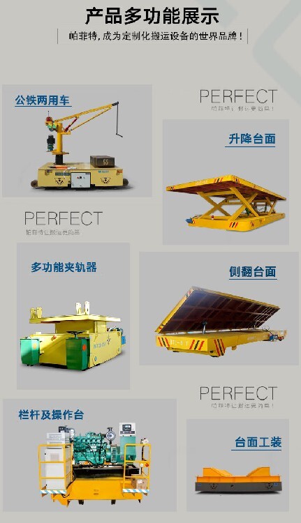 該系列平車具有安全性和機(jī)動(dòng)靈活性,對(duì)軌道鋪設(shè)要求較高(需要絕緣處理軌道),適用于載重量不大(≤60t)、使用頻率較高、中長距離運(yùn)輸場合。不受距離的限制,但運(yùn)行距離超過70米,需要增加變壓器數(shù)量來彌補(bǔ)軌道壓降。