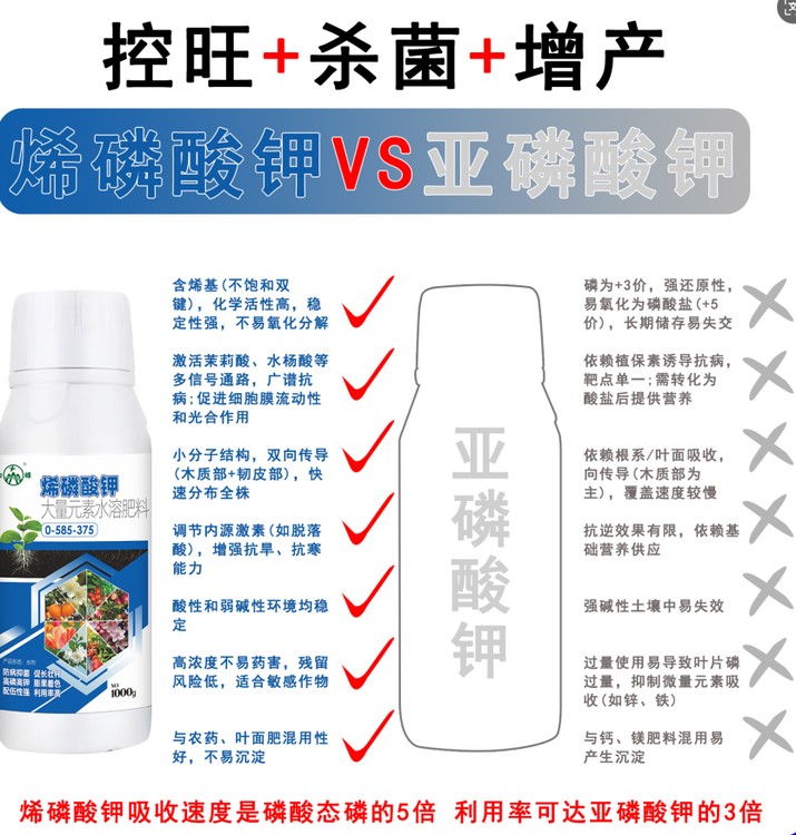 烯磷酸鉀作為新型植物刺激素,核心功效是雙向調(diào)控、綜合賦能作物生長。它既能補充作物所需的高磷高鉀營養(yǎng),促進根系發(fā)育、植株健壯,又能調(diào)控作物生長節(jié)奏,實現(xiàn)控旺促壯;既能誘導作物產(chǎn)生抗病能力,防控多種病害,又能改善土壤環(huán)境,提升土壤肥力;既能提升作物產(chǎn)量,又能優(yōu)化果實品質(zhì),兼顧生態(tài)性、安全性和性,適用于各類作物,是現(xiàn)代農(nóng)業(yè)種植中多功能、的優(yōu)質(zhì)農(nóng)資產(chǎn)品。