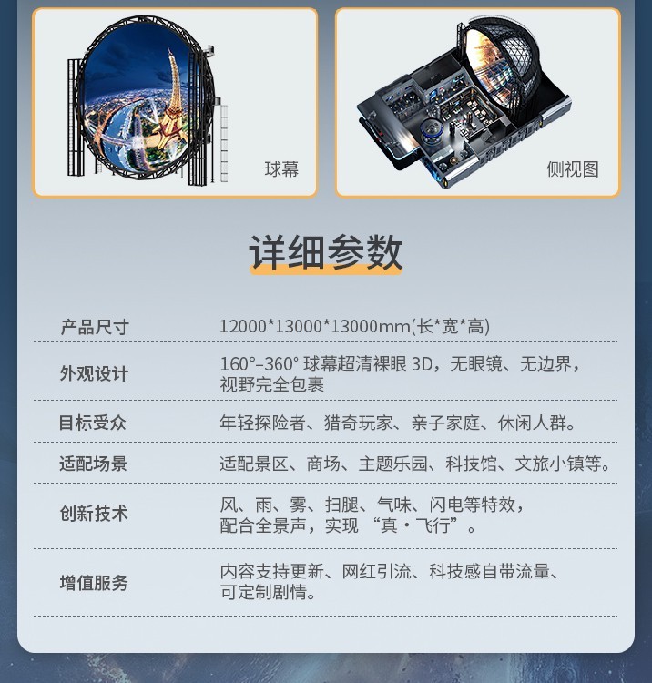 以懸浮技術(shù)與球幕系統(tǒng),還原真實(shí)飛行體感。凌空視角俯瞰壯美風(fēng)光,俯沖攀升帶來心跳加速,風(fēng)、霧、香氣同步渲染氛圍。無需 VR 設(shè)備,裸眼盡享沉浸式飛行,視覺震撼與體感刺激兼具,成為網(wǎng)紅必體驗(yàn)項(xiàng)目。