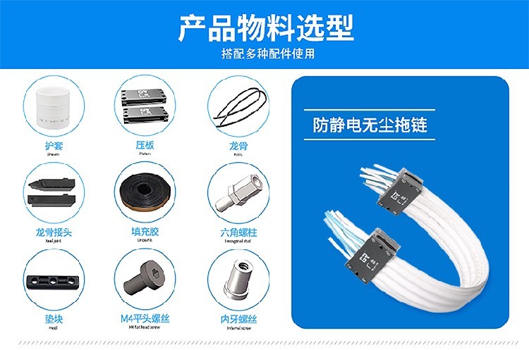 1千萬(wàn)次應(yīng)用領(lǐng)域半導(dǎo)體、新能源、面板制造、汽車、化工、醫(yī)療、光學(xué)、精密制造無(wú)塵拖鏈選型原則: