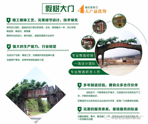 我們單縣憶古園林景觀承攬各地的假樹大門,生態(tài)園假樹大門,水泥假樹大門景觀工程施工,單縣憶古園林景觀致力于假樹大門,水泥假樹,生態(tài)園大門景觀的創(chuàng)新與施工,承接假樹大門,廣場、公園、小區(qū)、居家庭院等環(huán)境景觀的大門設(shè)計(jì)施工,本品有著外形優(yōu)美,款式多樣,安裝方便的優(yōu)勢,不怕水火,不需養(yǎng)護(hù),一次成型,長久使用,施工可根據(jù)甲方的施工場所進(jìn)行合理布局,產(chǎn)品外觀可靈活運(yùn)用,產(chǎn)品成品優(yōu)雅大方,我們單縣憶古愿與各界朋友謀求共同發(fā)展,同時(shí)也歡迎新老客戶與我們溝通洽談。