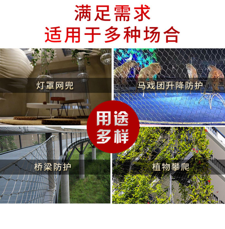 不銹鋼繩網(wǎng)用于虎獅豹圍網(wǎng)、籠舍網(wǎng)、圍欄網(wǎng)等安全防護網(wǎng),具有較強的抗拉力、破斷力,能夠輕易抵擋老虎、獅子、豹子等兇猛動物對籠舍防護網(wǎng)的沖擊破壞,同時不銹鋼繩網(wǎng)具有很好的柔韌性,可以有效保護動物皮毛不受任何傷害。而且動物園、動物園、表演場等場所是我們觀賞虎獅豹的場所,因此在安全防護的前提下?lián)碛辛己玫挠^賞視線是虎獅豹籠舍圍網(wǎng)建設的重要目標。華美不銹鋼繩網(wǎng)采用交叉編織,菱形網(wǎng)孔結(jié)構(gòu),加上華美不銹鋼繩網(wǎng)特有的金屬色調(diào)與質(zhì)感,通透、長時間觀賞動物毫無疲勞感,是動物籠舍防護網(wǎng)的選擇。