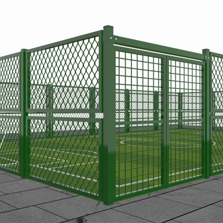 組裝U型卡式球場(chǎng)圍網(wǎng)是一種新型的產(chǎn)品樣式,它的產(chǎn)品結(jié)構(gòu)采用組裝式結(jié)構(gòu),立柱與橫管之間采用套管連接或抱箍式卡片進(jìn)行連接,包塑?chē)W(wǎng)與框架通過(guò)鋼筋固定在框架內(nèi)側(cè)焊接好的U型卡上。U型卡是一種連接件,鋼筋放入卡槽里,然后穿上螺絲將鋼筋卡住予以固定。