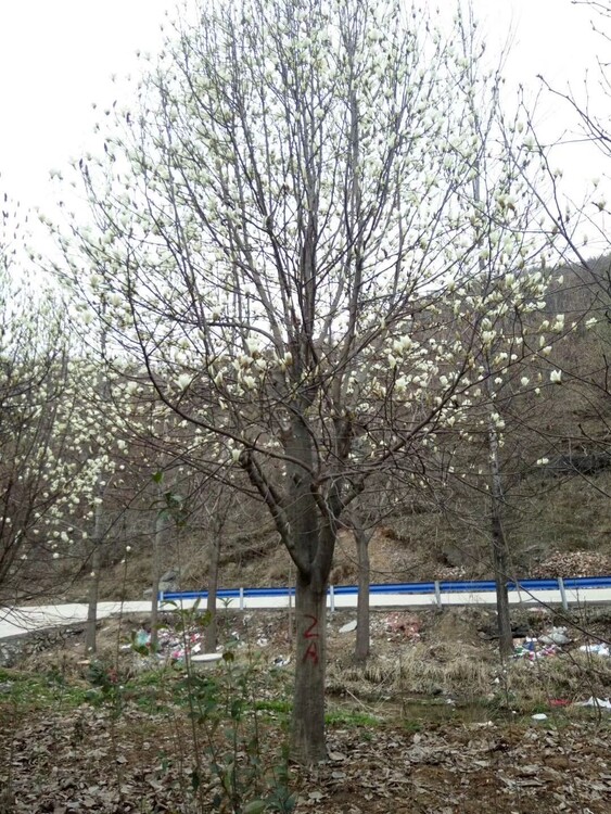 施肥。白玉蘭苗成活后根系向外伸展,在苗木新葉長出、新芽抽條時施少量氮肥,可促進苗木快速生長。追肥每株施用尿素 25~30 g,或氮磷鉀復合肥 30~40 g,化水澆灌或雨天撒施。追肥可視樹苗生長情況進行 1~2 次。由于白玉蘭樹生長速度快,同化作用強,年初大量開花,秋季大量落葉,需要肥力補充,尤其需要磷肥補充。培育中的玉蘭樹施肥一般以基肥為主,秋冬季結合林地管理一并施入。二年生幼樹施10%過磷酸鈣加 90%雞糞 2~3 kg/株、氮磷鉀復合肥 50~100 g/株,隨樹長大逐年增加。